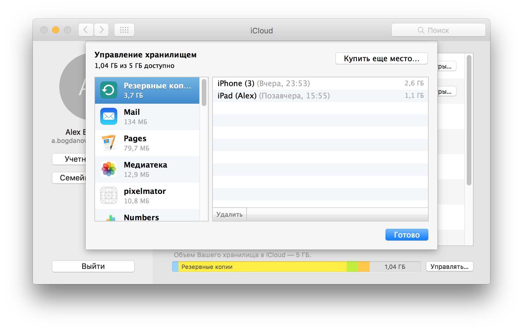 Бывает так, что по непонятным причинам удалить копию с устройства не получается. В этом случае на помощь приходит компьютер: на OS X открываем «Настройки» — iCloud (на это панель управления iCloud). Снова нажимаем «Управлять» и в открывшемся списке резервных копий удаляем ненужную.
