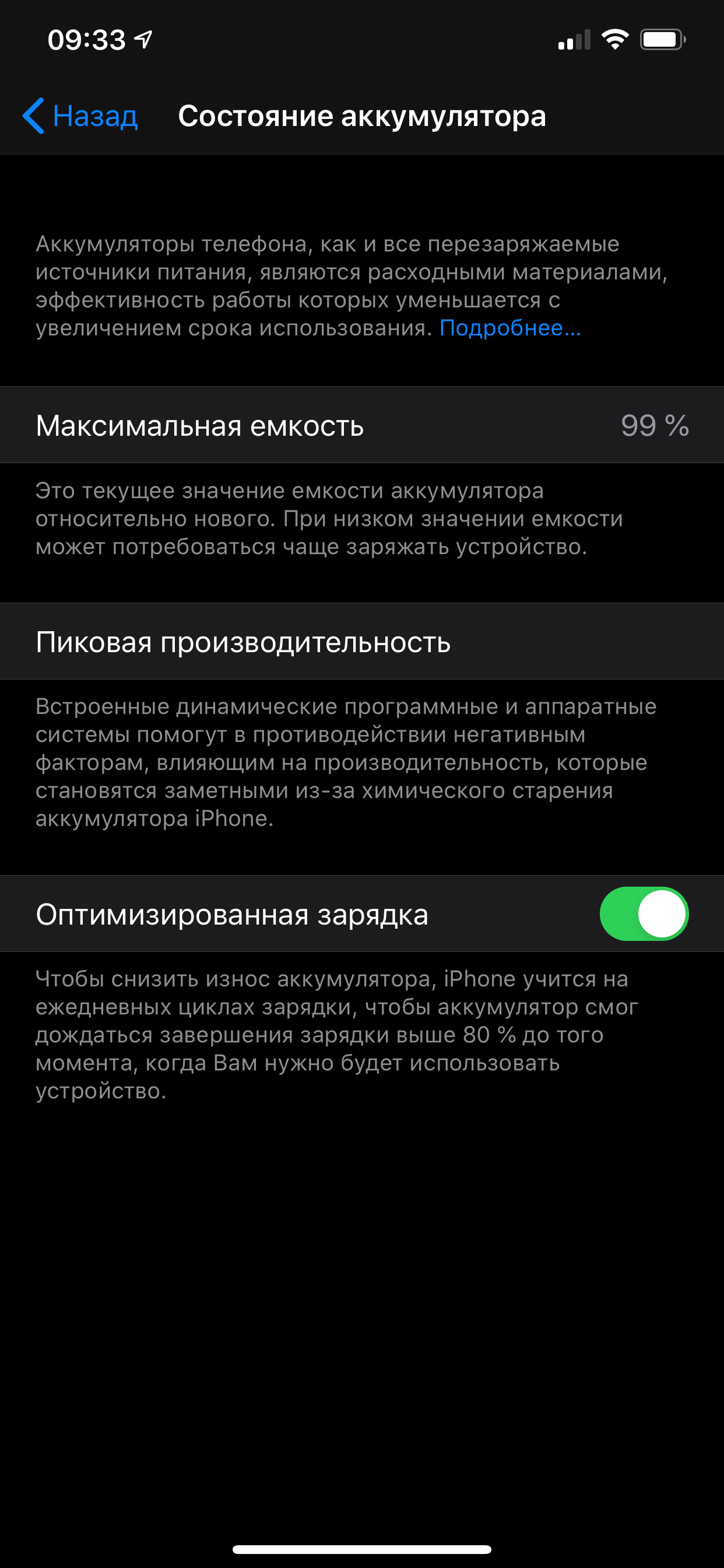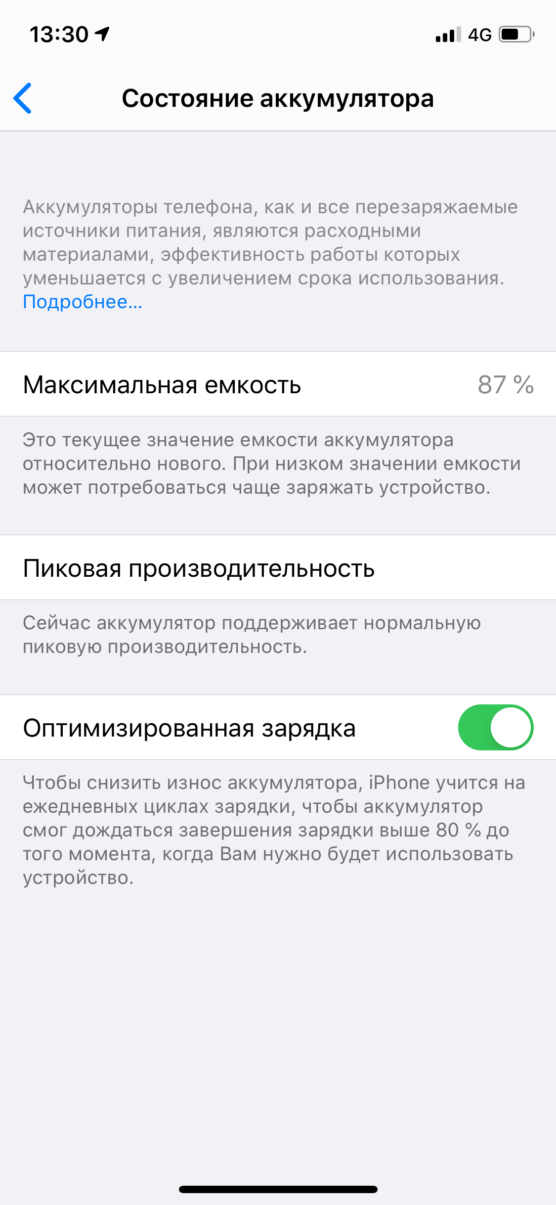 После них iPhone впервые предупредит о том, что аккумулятор «исхудал», и включит режим снижения производительности. Его можно запретить до следующей незапланированной перезагрузки в том же меню, что я упоминал выше, пункт «Пиковая производительность». Но проблему в целом это не решит.