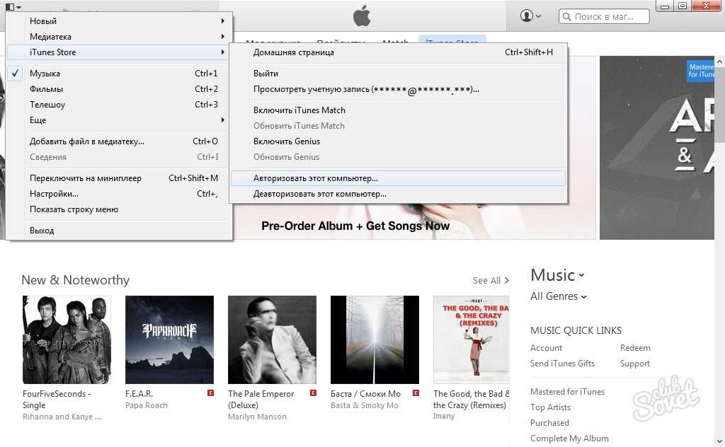 Чтобы выполнить деавторизацию компьютера в iTunes нужно выполнить следующие шаги:Можно деавторизоваться и по-другому. Для этого перейти в магазин iTunes Store и кликнуть левой кнопкой мышки по треугольнику справа от вашего адреса электронной почты. Во появившемся меню выбрать Выйти (если при регистрации вы выбирали русскую локализацию), или Sign Out (если регистрировались на англоязычные данные).