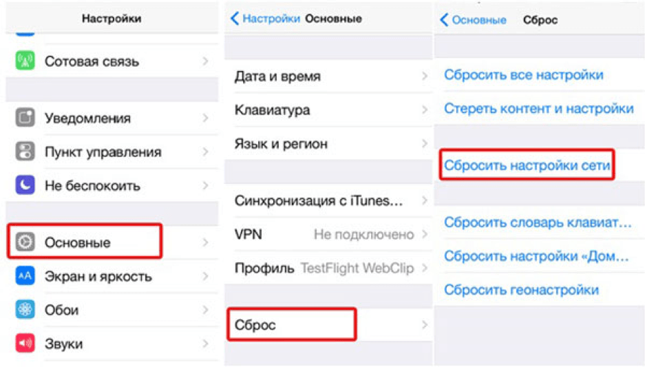 - Сбрасываем «Настройки сети» («Настройки» — «Основные» — «Сброс» — «Сбросить настройки сети»).
