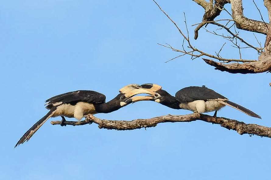 Это изображение пестрых Малабара. Это мужская и женская особь. Я некоторое время наблюдал за птицами-носорогами, прежде чем сфотографировать их. Как только их клювы выстроились в линию, и стали симметричными, я нажал на кнопку спуск.