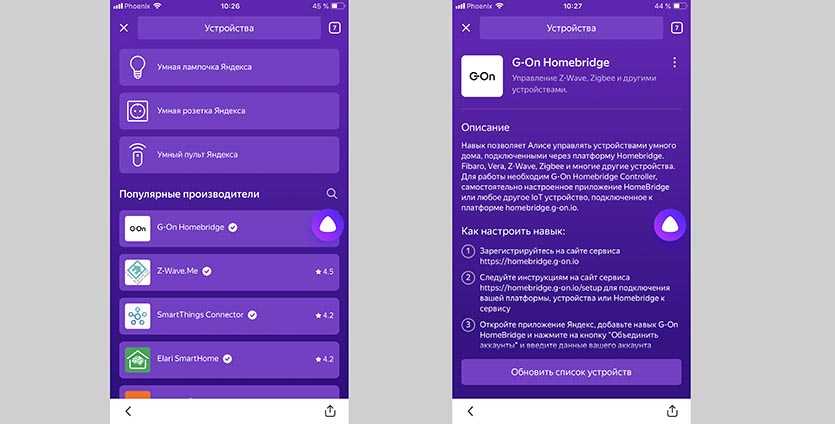 4. Переходим в приложение Яндекс на iPhone. В разделе Устройства – Умный дом добавляем новое и выбираем плагин G-On Homebridge.