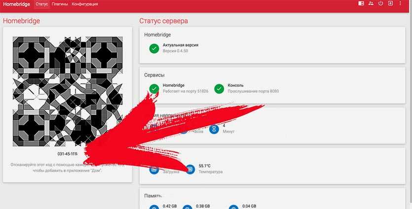 3. Параметр “pin” опциональный, его следует заполнить (добавить строку в конфигурации), если в обычном режиме связка не заработала. Заполнить значение следует ключом от сервиса HomeBridge. Он отображается в блоке bridge или на главной странице веб-интерфейса.