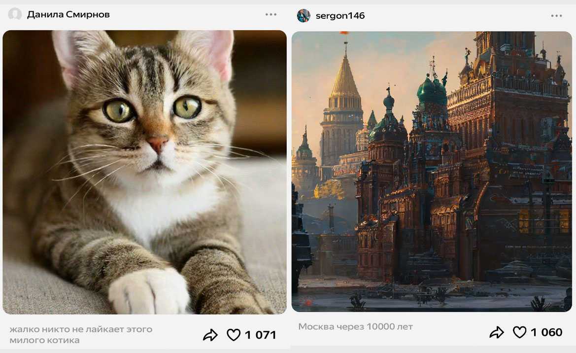 Только вот в Шедевруме нельзя загрузить свою фоточку обеда, пляжа или запилить короткое видео о своей жизни. Вместо этого можно лишь генерировать картинки и выкладывать получившийся результат на обозрение всем желающим, собирая «лойсы» за особо удачно получившийся креатив.