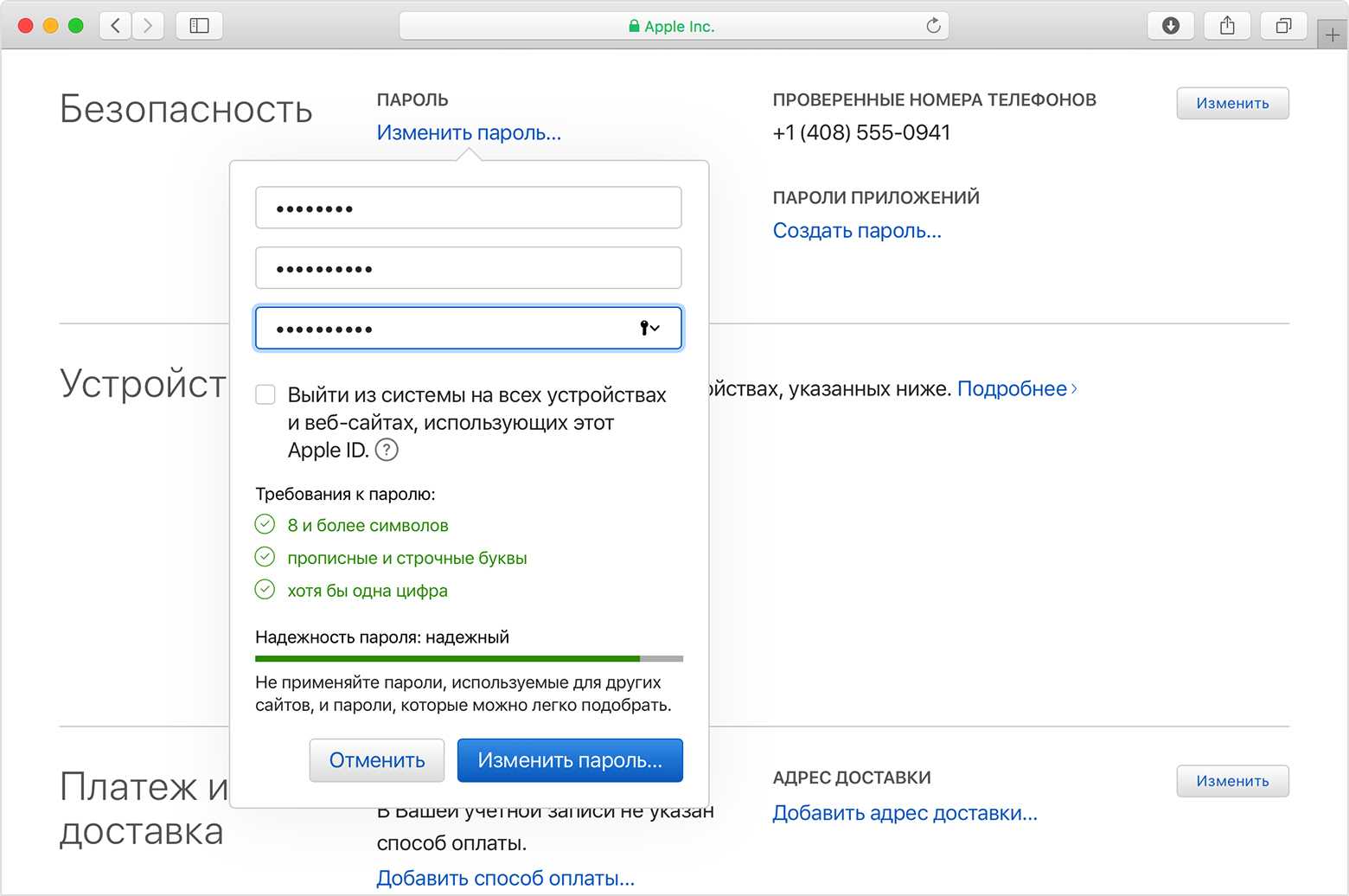 Правила компании Apple требуют от вас использования надежных паролей для идентификатора Apple ID. Пароль должен содержать не менее восьми символов, включая прописные и строчные буквы и хотя бы одну цифру. Также можно добавлять дополнительные символы и знаки препинания, чтобы сделать пароль еще более надежным. Кроме того, компания Apple предъявляет к паролям другие требования, гарантирующие, что угадать пароль будет сложно.