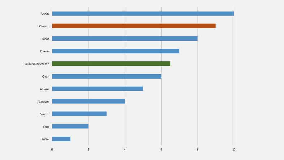 Твердость разных веществ по шкале Мооса: чем выше значение, тем сложнее поцарапать конкретный материал