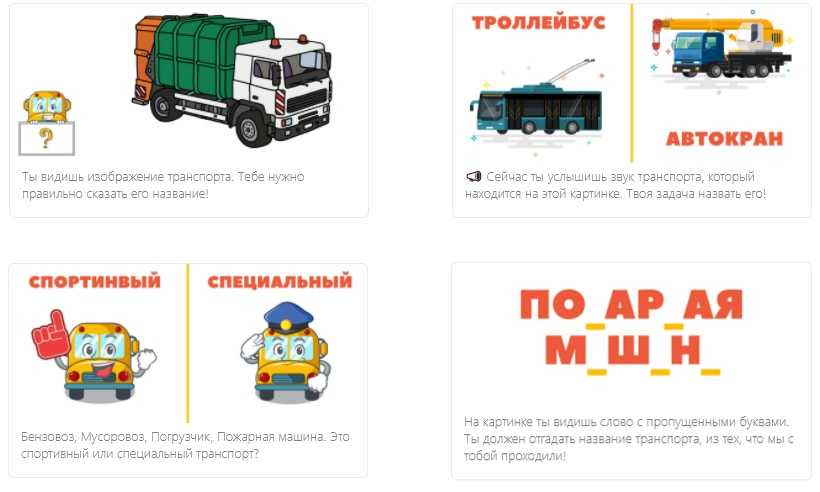 «Изучаем транспорт». Навык позволяет узнать о разных видах транспорта и его назначении. Но самое в нем прикольное — угадывать транспорт по звуку. На компьютере или смартфоне еще доступны задания с картинками.
