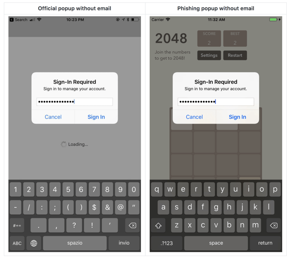 В своем блоге исследователь объясняет, что UIAlertController API позволяет разработчикам приложений создавать диалоговые окна, которые как две капли воды похожи на настоящие, системные запросы паролей от iCloud, iTunes или GameCenter. Заметить подобную фишинговую атаку будет практически невозможно, доказательство тому – изображения, приведенные ниже. Фишинговые запросы паролей в обоих случаях находятся справа. Нужно признать, что распознать фальшивку едва ли возможно.