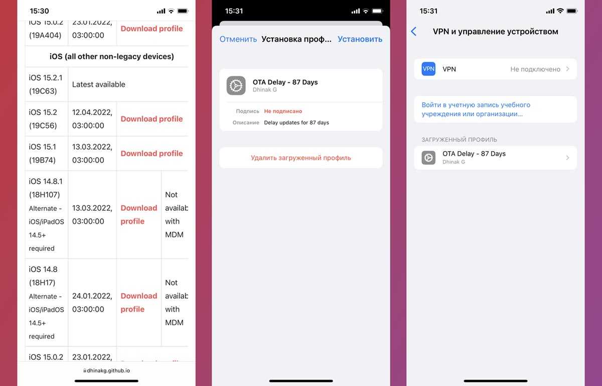 ◈ Перейдите на сайт проекта DelayOTA. Здесь увидите профили для версий iOS, на которые можно обновиться на данный момент. Возле каждого обновления указана дата, до которой он будет доступен.