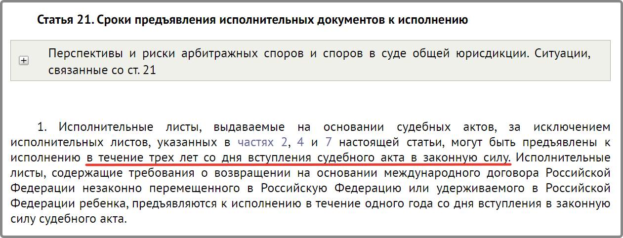 Правило о 3-годичном периоде для представления исполнительного документа является общим. Из общего правила есть исключения. Например — взыскание алиментов на несовершеннолетнего ребенка. Если взыскатель не обратится к приставам в течение 3-летнего периода, ничего страшного не произойдет. Подать заявление допускается, пока ребенку не исполнилось 18 лет.