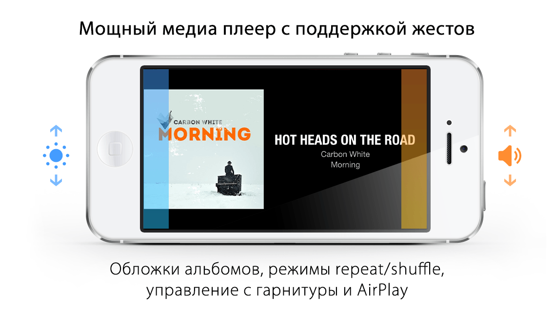QWE создан по принципу «всё в одном»: утилита умеет и воспроизводить загруженное. Плеер можно вызвать «свайпом» из нижней части экрана. Его «жестовая» природа проявляется и в других функциях. Одним «тапом» можно включать и выключать трек. Удерживание пальца в правой части экрана и последующее движение вверх-вниз активирует управление громкостью. Интересное решение, ранее с подобным встречаться не приходилось. «На сдачу» — точный скраббинг, поддержка управления с гарнитуры и AirPlay. Неплохо? Стандартный плеер уже завидует!