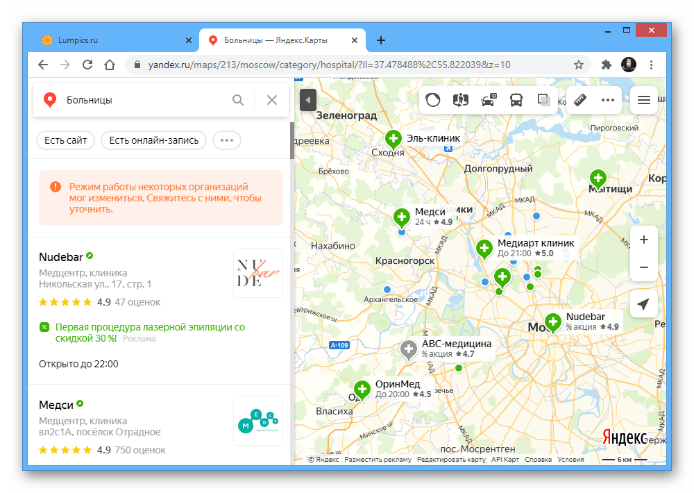 В плане поиска Яндекс.Карты практически не отличаются от Гугла, предоставляя полностью аналогичные возможности. Можно в равной степени использовать поиск заведений в рамках города или попросту указав название компании или тип организации.