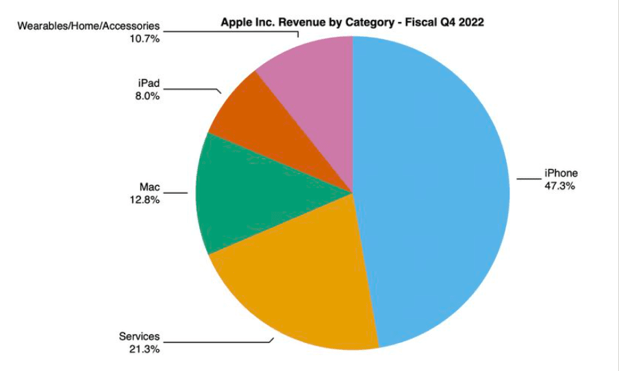 В 2020 финансовом году Apple сообщила об общем объеме чистых продаж в размере 260.17 млрд долларов, при этом на iPhone приходится почти половина от общей суммы в 137.7 млрд долларов. iPad и Mac были следующими двумя крупнейшими источниками дохода в размере 25.8 млрд долларов и 56.9 млрд долларов соответственно.