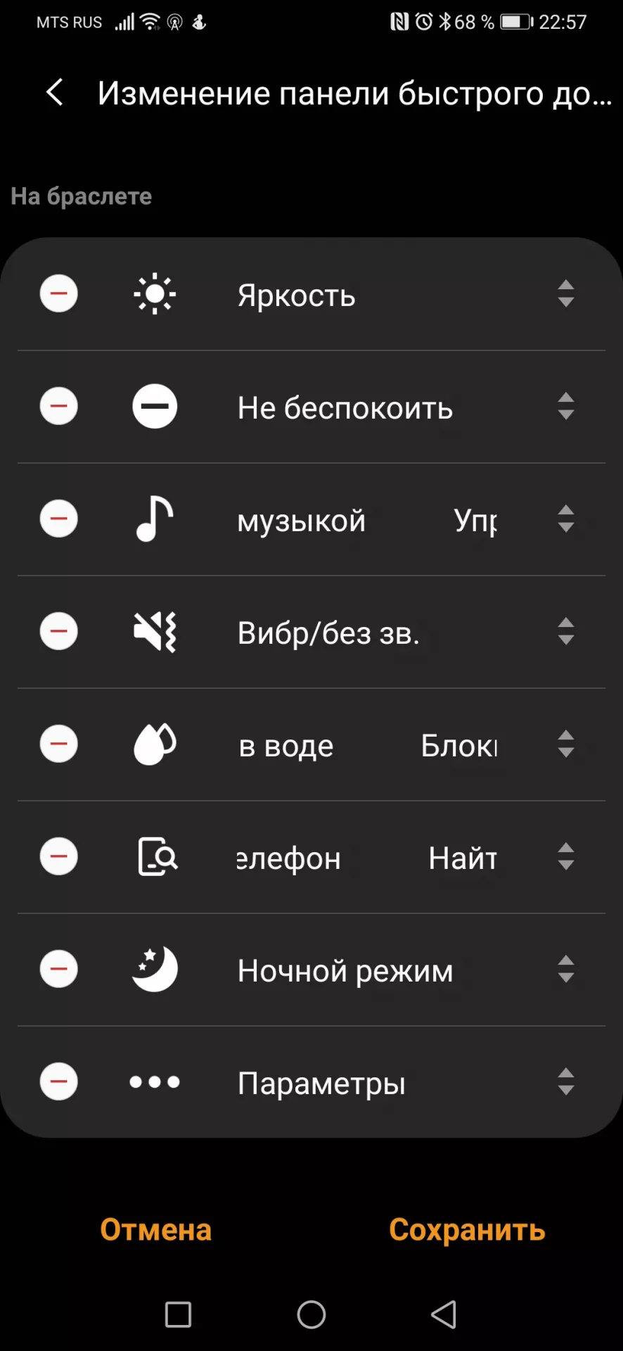 Меню браслета построено по следующей логике: свайп влево – откроются уведомления. Свайп вправо – перечень виджетов, количеством и порядком которых можно «рулить» в приложении. Свайп вниз – появится аналог шторки смартфона, где можно управлять яркостью и беззвучным режимом. Называется «Панель быстрого доступа» и есть возможность настраивать этот список в телефоне.