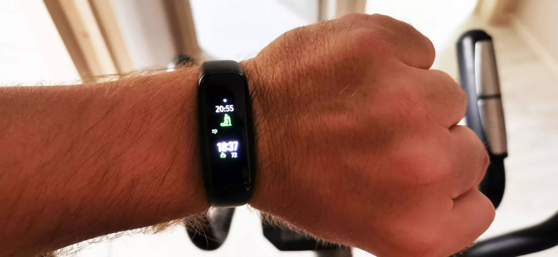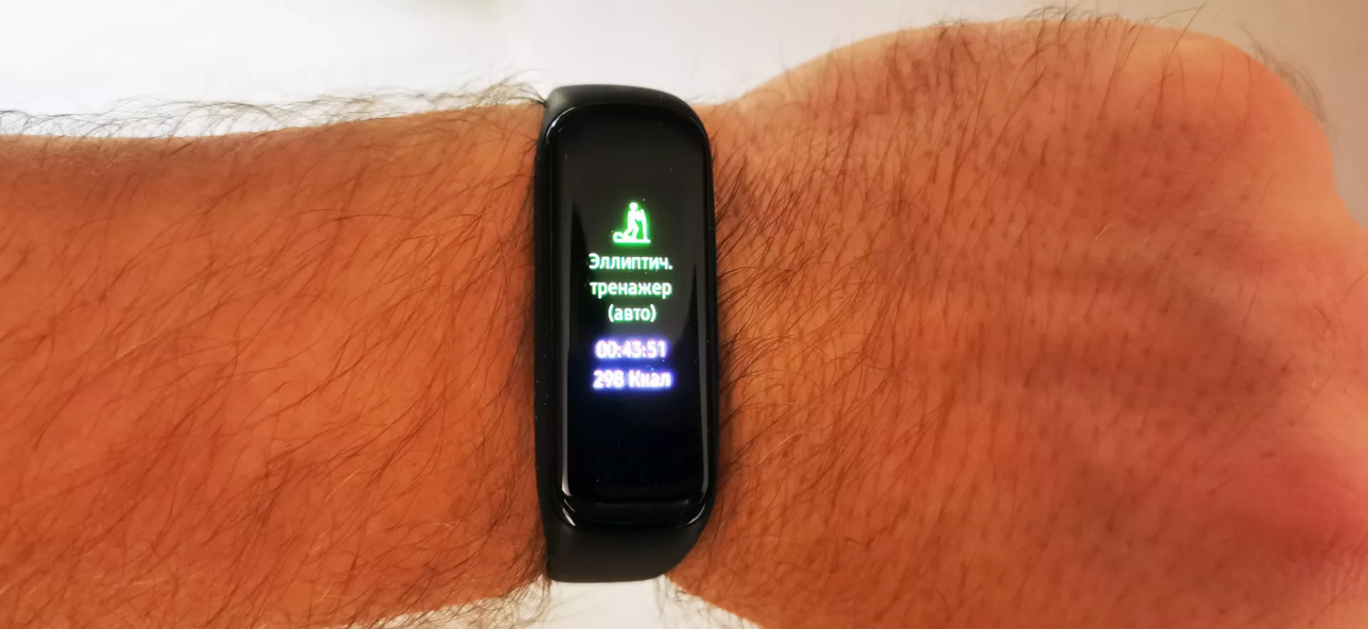 Браслет считает шаги, калории и время тренировок. Быстрый шаг от метро до работы он воспринимает автоматически как тренировку. Эллиптический тренажёр тоже задетектил самостоятельно. Это круто, что не обязательно нажимать на браслете «Старт». Хотя мое занятие на эллиптическом тренажёре заняло ровно час, Fit2 записал только 43 минуты.