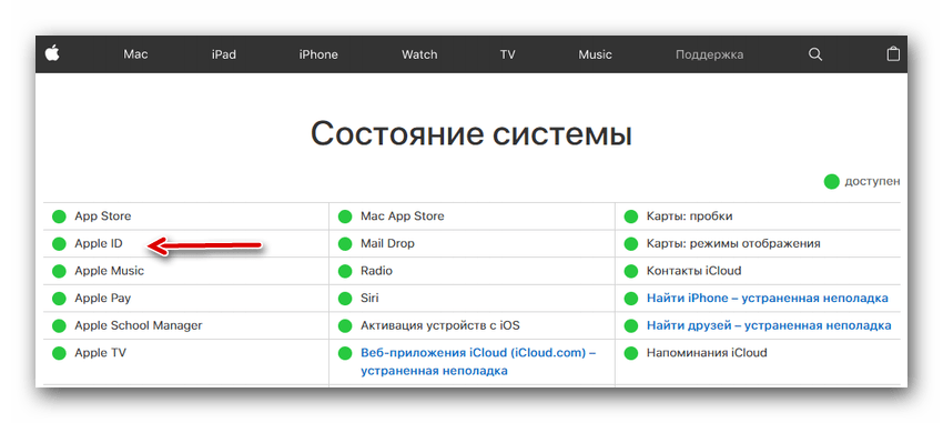 https://www. apple. com/ru/support/systemstatus/ и в открывшемся списке находим сервис, в который у вас не получается зайти. Данные постоянно обновляются в автоматическом режиме и, если напротив выбранного сервиса вы увидите красный кубик, то это значит, что сейчас он недоступен, необходимо подождать какое-то время. Если же с сервисом все в порядке, проблема кроется в учетной записи.