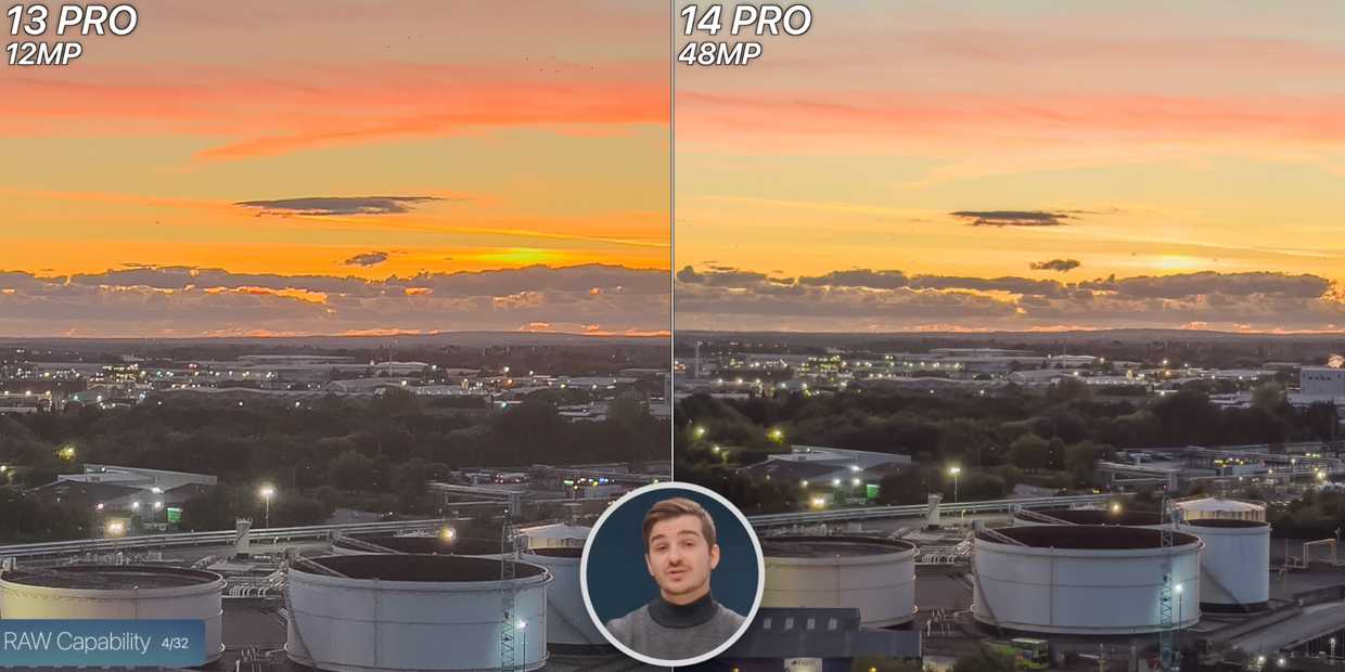Чтобы не забить место на смартфоне за две недели, снимать нужно будет в обычном режиме 12 МП (3 МБ на фото), а не в рекламируемых 48 МП (80 МБ на фото). И в этом стандартном режиме разницы между новым и прошлом поколении почти нет из-за того, что оптическая сила объектива осталась прежней: ƒ/6.9 в iPhone 13 Pro против ƒ/6.7 в iPhone 14 Pro в переводе на полный кадр.