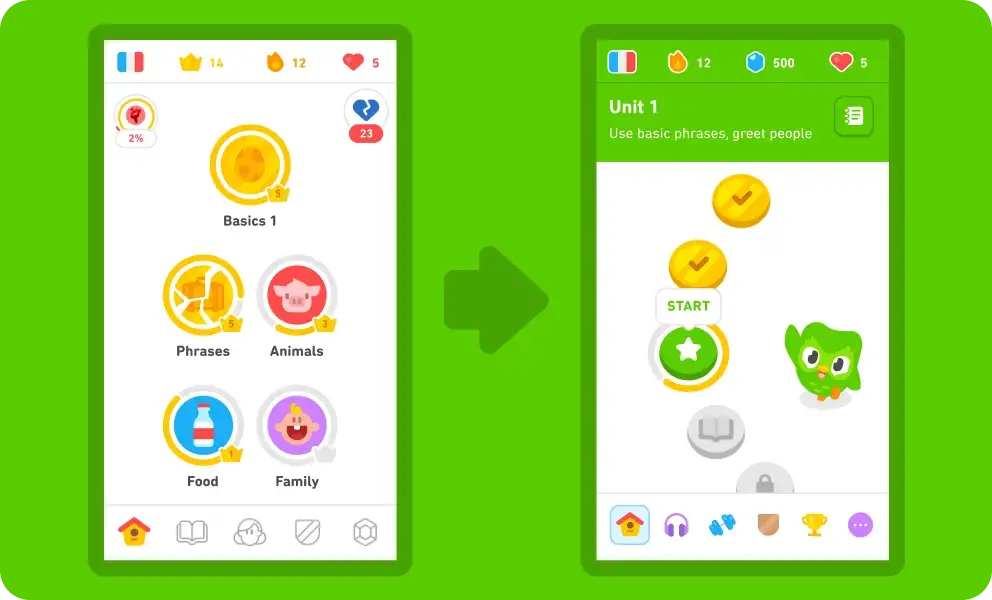 Чтобы удержать внимание людей, дизайнерам стоит использовать анимацию и пытаться вдохнуть жизнь в статичные экраны и изображения, чтобы они как можно больше погружали человека в виртуальную среду. Если вы пользуетесь сервисом Duolingo, вы наверняка заметили, что после недавнего обновления на платформе появилось больше анимированных иллюстраций и анимационных переходов между экранами