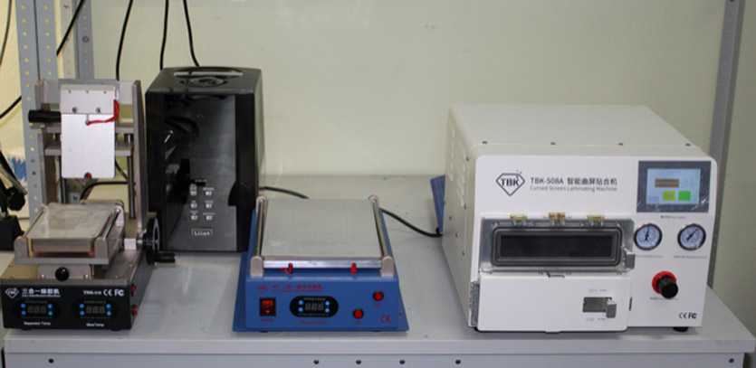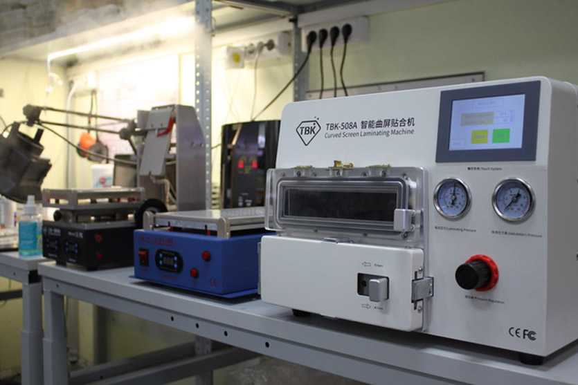 На переднем плане автоклав и вакуумный пресс для качественной склейки дисплеев с двумя отсеками. Верхний отсек – вакуумный пресс, предназначен для склейки дисплеев со стеклом. Нижний – автоклав, служит для удаления остаточных пузырей под прессом с помощью избыточного давления. Стоит 90 тыс. рублей.