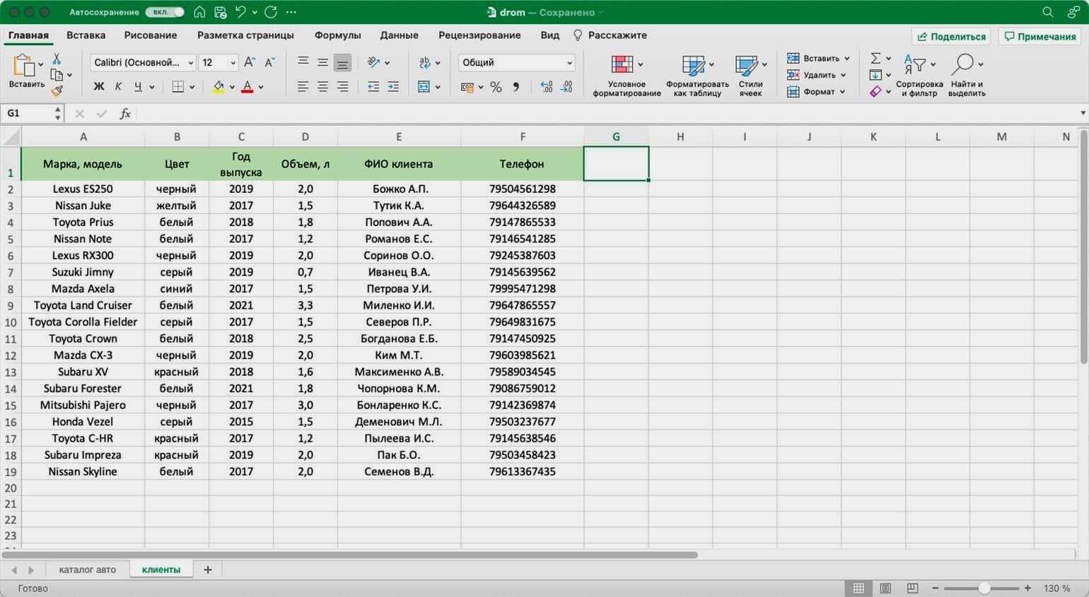 - Выбираем первое значение столбца «Марка, модель» в таблице с клиентами. Это ячейка A2.