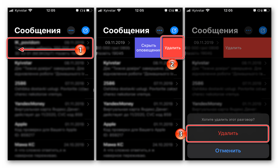 Способ 1: Жест Проще всего удалить одну переписку с помощью жеста – свайпа по ней в направлении справа налево. Сделав это, нажмите по надписи «Удалить», а затем по одноименной кнопке в появившемся окошке с вопросом. Аналогичным образом можно удалить и другие диалоги, но для этих целей лучше воспользоваться рекомендациями из «Способа 3» ниже.