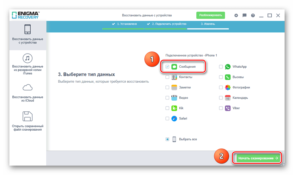 В следующем окне нужно выбрать тип данных, который программа будет сканировать на наличие удалённых файлов. Поставьте галочку напротив «Сообщения» и нажмите «Начать сканирование».