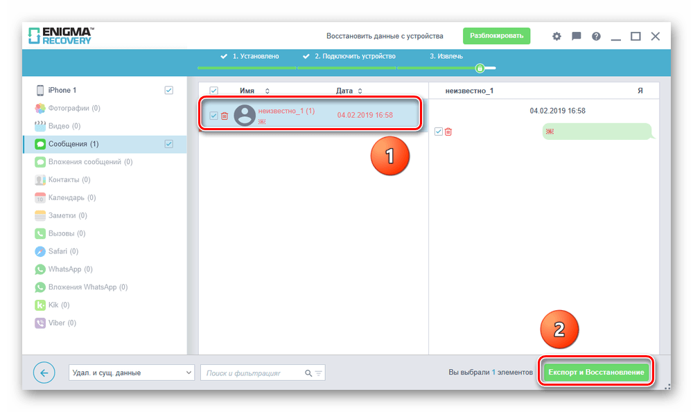 Подождите, пока закончится сканирование устройства. По завершении Enigma Recovery покажет недавно удалённые СМС. Для восстановления выберите нужное сообщение и нажмите «Экспорт и восстановление».