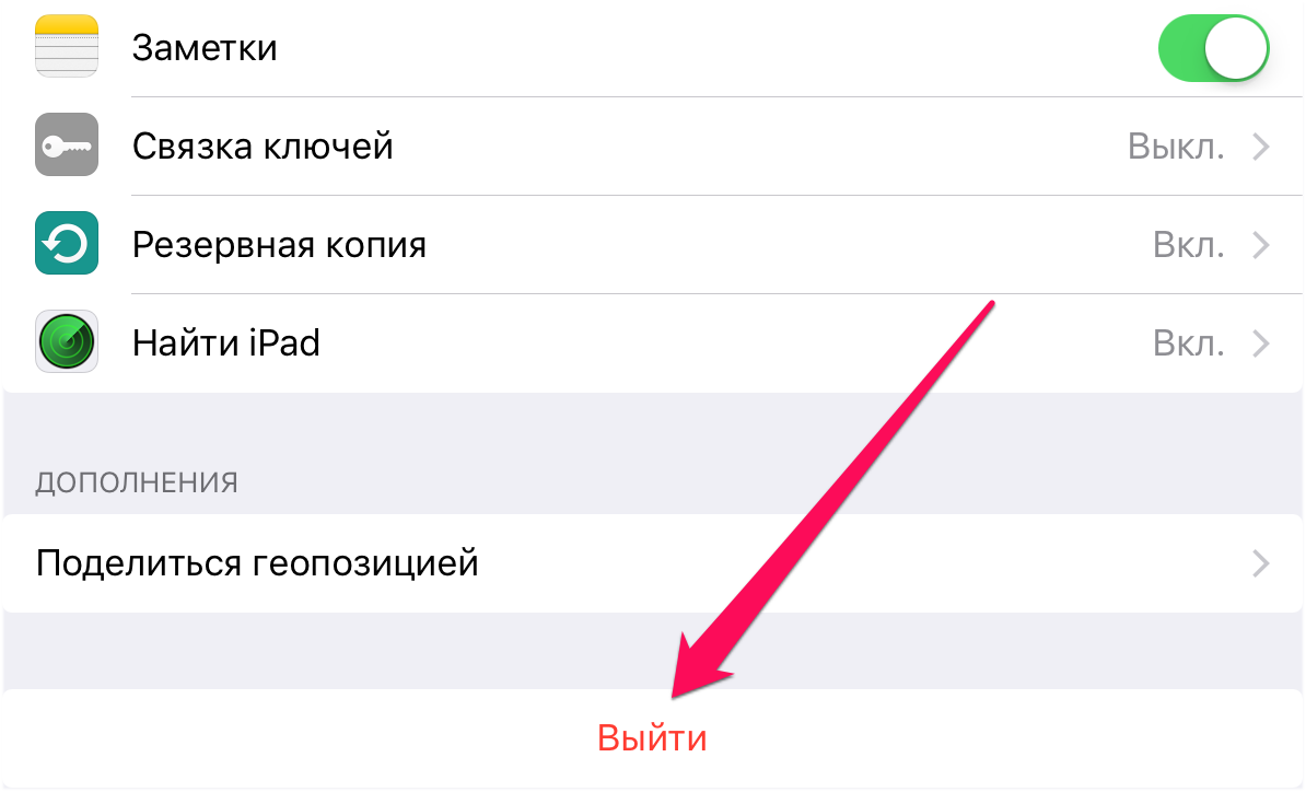 Также выйти и вновь зайти стоит в учетную запись iCloud. Для этого перейдите в меню «Настройки» → iCloud и в самом низу страницы нажмите «Выйти». После повторно авторизуйтесь в iCloud на этой же странице.