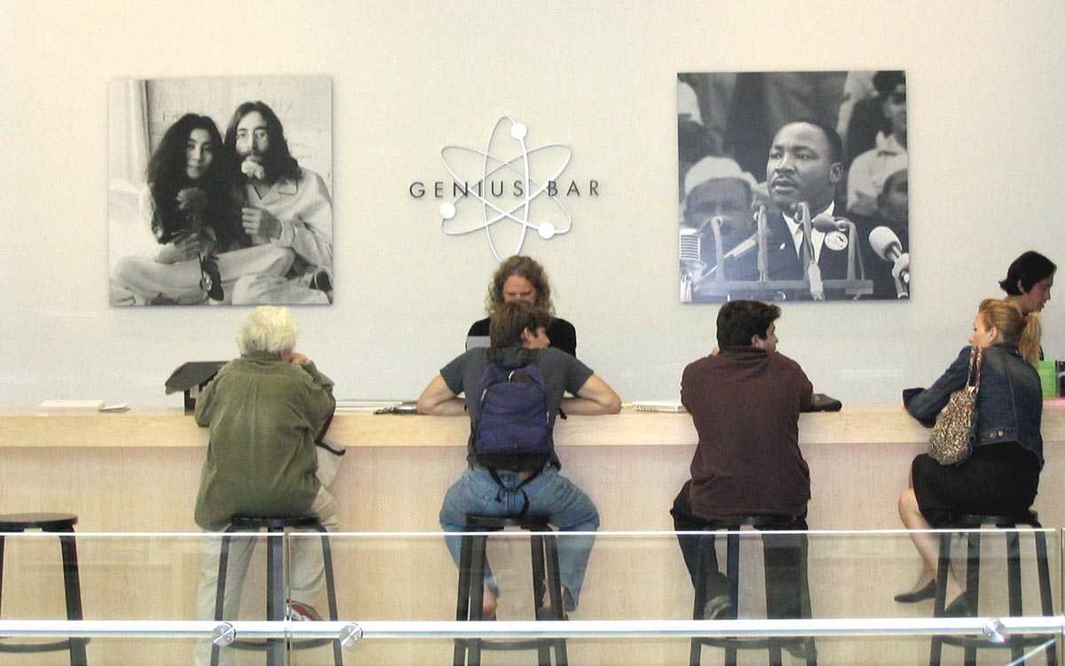 Это отдельное пространство, где посетители могли задать интересующие вопросы, попросить помощи в решении проблем или просто пообщаться с так называемыми “гениями”. Хорошо разбирающиеся в технике Apple сотрудники с легкостью шли на контакт, при этом перед ними не стояла цель продать гаджет подороже или навязать необязательные дополнительные аксессуары.