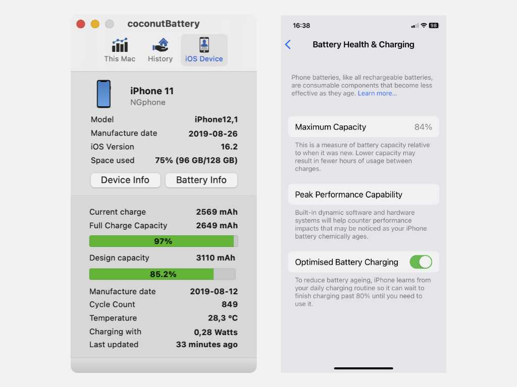 Впрочем, на практике спустя 849 циклов полной перезарядки состояние аккумулятора моего iPhone 11 находится на уровне 84% (∼2650 из 3110 мА·ч), что подтверждается и встроенными в iOS инструментами («Настройки» → «Аккумулятор» → «Состояние аккумулятора»), и популярным приложением для Mac coconutBattery.