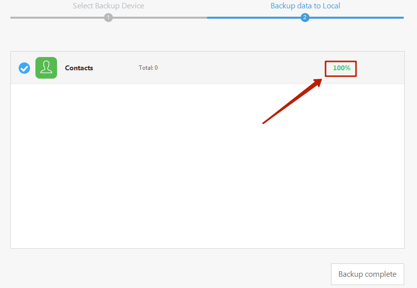 Если напротив иконки «Contacts» значится 100%, формирование резервной копии завершено.