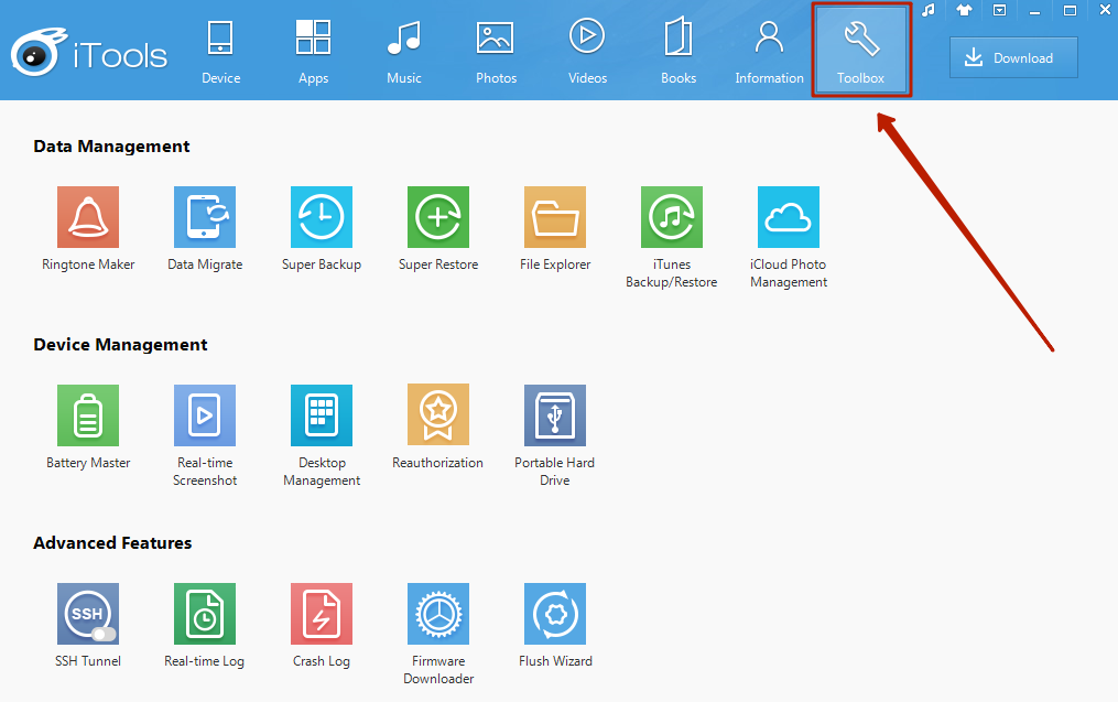 Шаг 1. Зайдите в iTools и откройте вкладку «Toolbox».