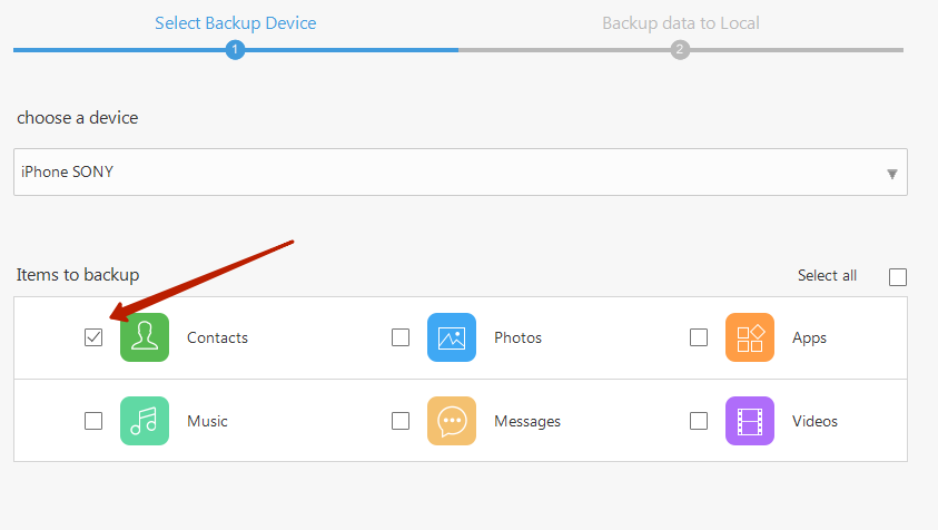 Шаг 3. В следующем окне вы увидите перечень данных, которые можете включить в резервную копию. Снимите галочки со всех пунктов кроме «Contacts».