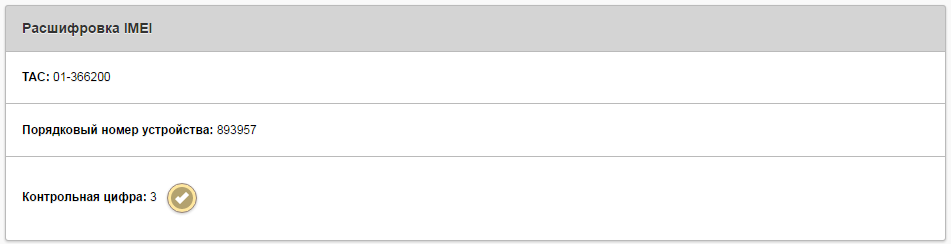 - Номер TAC – описывает модель и происхождение телефона (8 первых цифр) Порядковый номер гаджета – является уникальным для каждого аппарата (6 последующих цифр) Контрольная цифра – 15-я по счету цифра, позволяющая проверить корректность всех предыдущих. Контрольная цифра вычисляется по алгоритму «Луна» — ознакомиться с этим алгоритмом можно здесь.