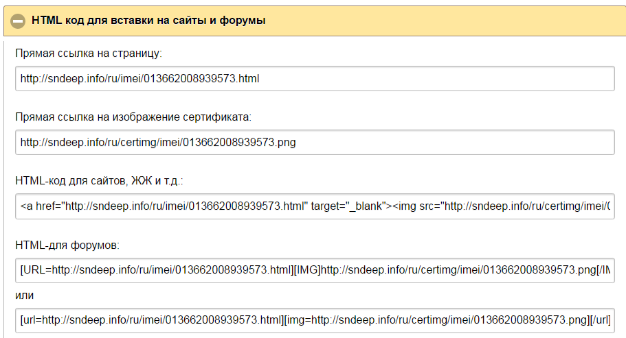 Сертификат в виде баннера можно вставить на другие ресурсы. Нажмите кнопку «HTML-код для вставки на сайты и форумы», и вам окажутся доступны всевозможные ссылки и коды: