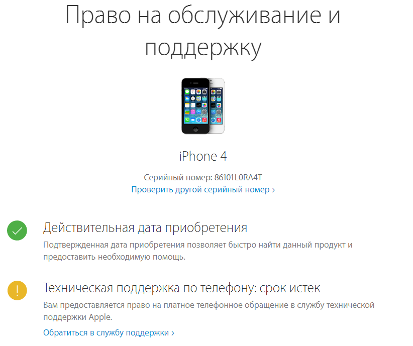 Шаг 4. Если iPhone не китайский, вы увидите его модель и прочую информацию, например, возможность получения поддержки от Apple по телефону. В ином случае, вы увидите сообщение «К сожалению, этот серийный номер не является верным. Проверьте имеющиеся данные и повторите попытку», а значит что лучше обойти этого горе-продавца стороной.
