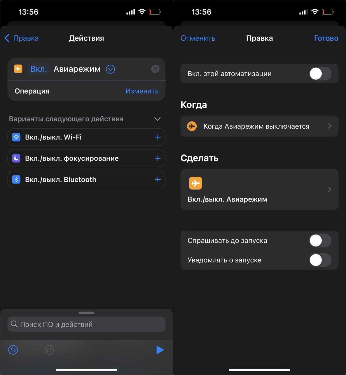 Пролистайте список и выберите «Авиарежим» и в графе «Когда» нажмите «Выключается». В строке поиска снова найдите «Авиарежим» и нажмите «Не спрашивать». Сохраните команду.