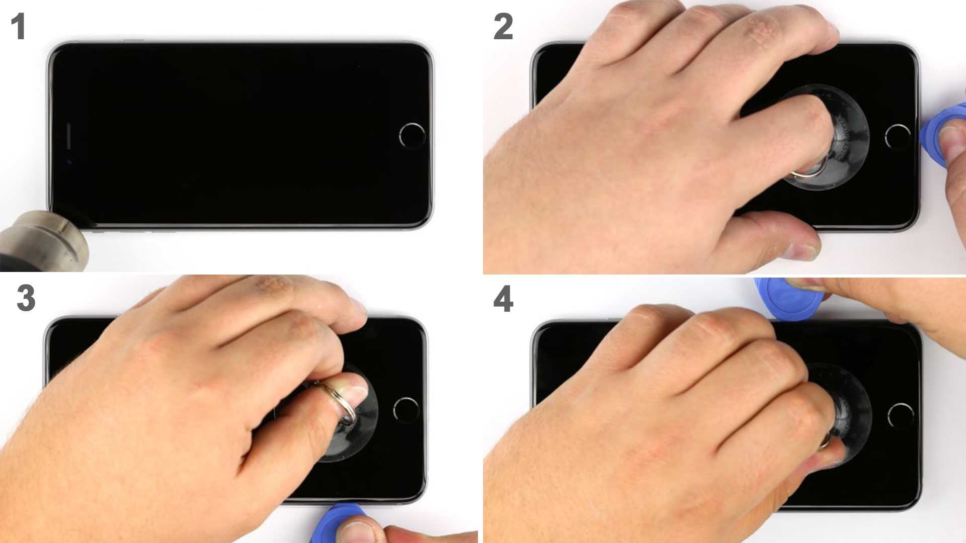 Далее вам нужно отсоединить дисплей. Положите ваш iPhone 6s Plus на чистую, гладкую поверхность, чтоб не поцарапать заднюю крышку. Для того, чтоб отсоединить дисплей, вам понадобится присоска, пластиковый медиатор и обычный фен. Экран телефона приклеен к раме. Используя фен, прогрейте края дисплея примерно до 60 градусов. Далее установите присоску на нижний край устройства, над кнопкой «Домой» или рядом с этой кнопкой. Потяните за присоску вверх, как бы поднимая дисплей. Теперь постарайтесь вставить пластиковый медиатор между алюминиевой рамой и дисплеем. Обычно это не получается с первого раза и для этого процесса вам нужно будет несколько попыток. Как только между частями образовался зазор, вы можете открыть дисплей, слегка повернув медиатор