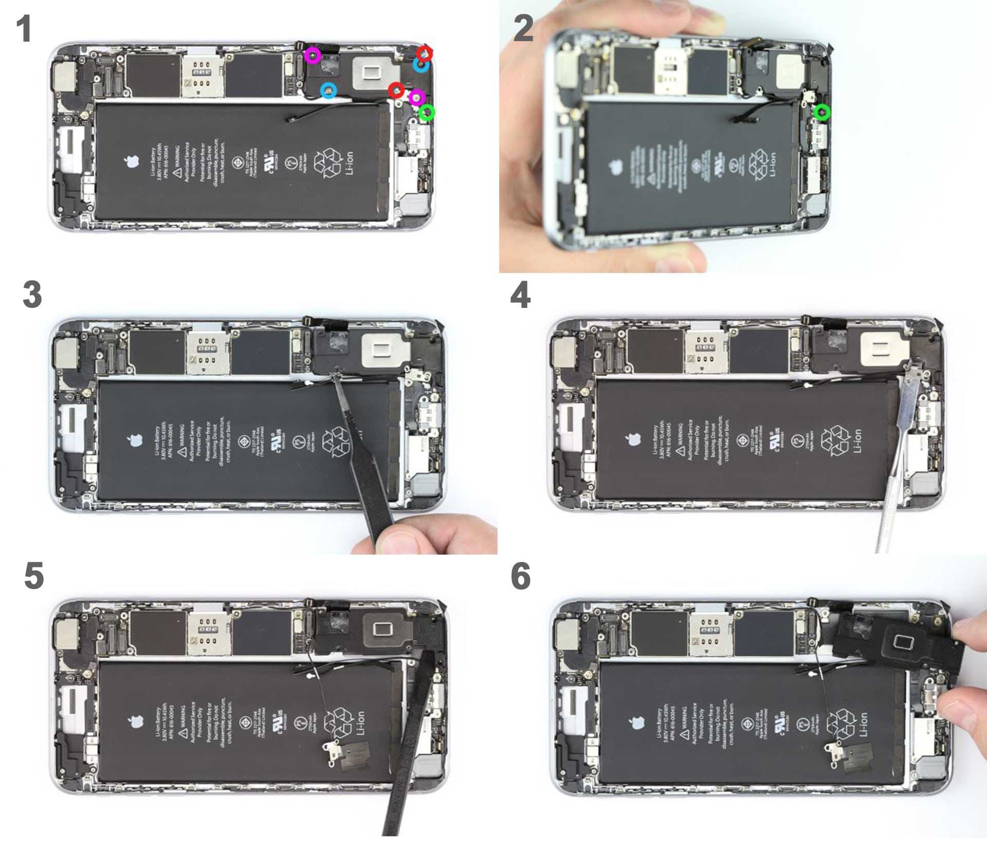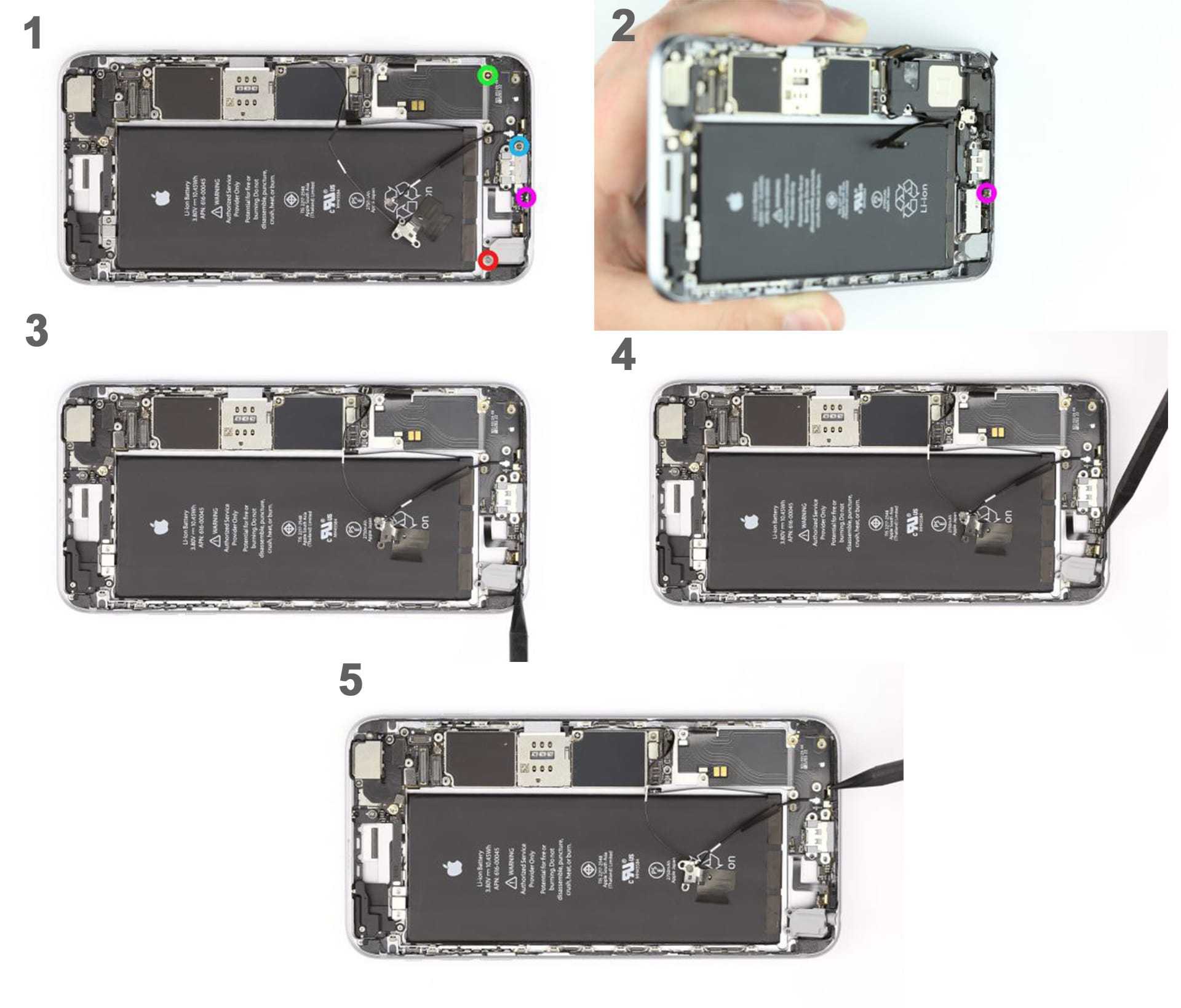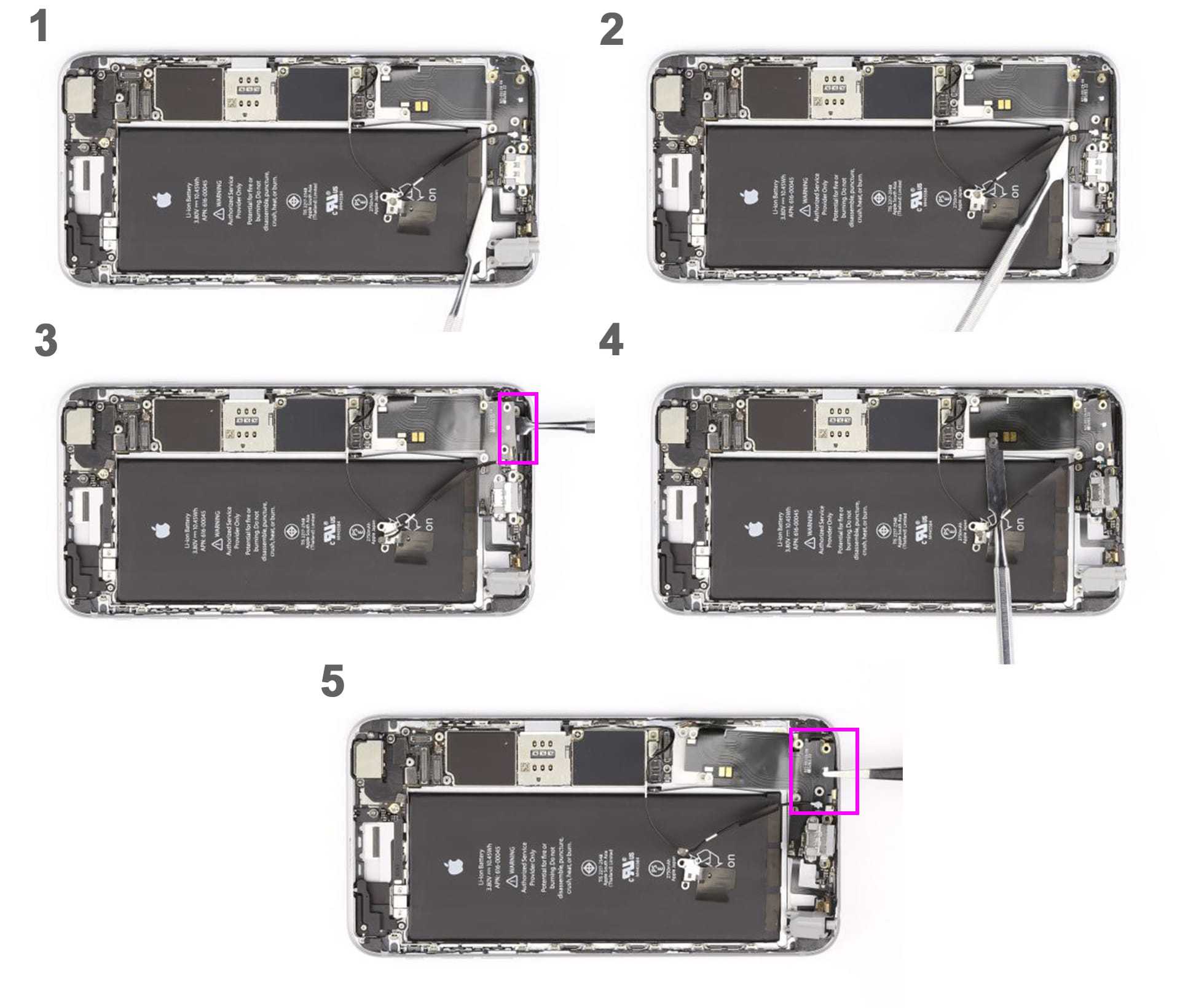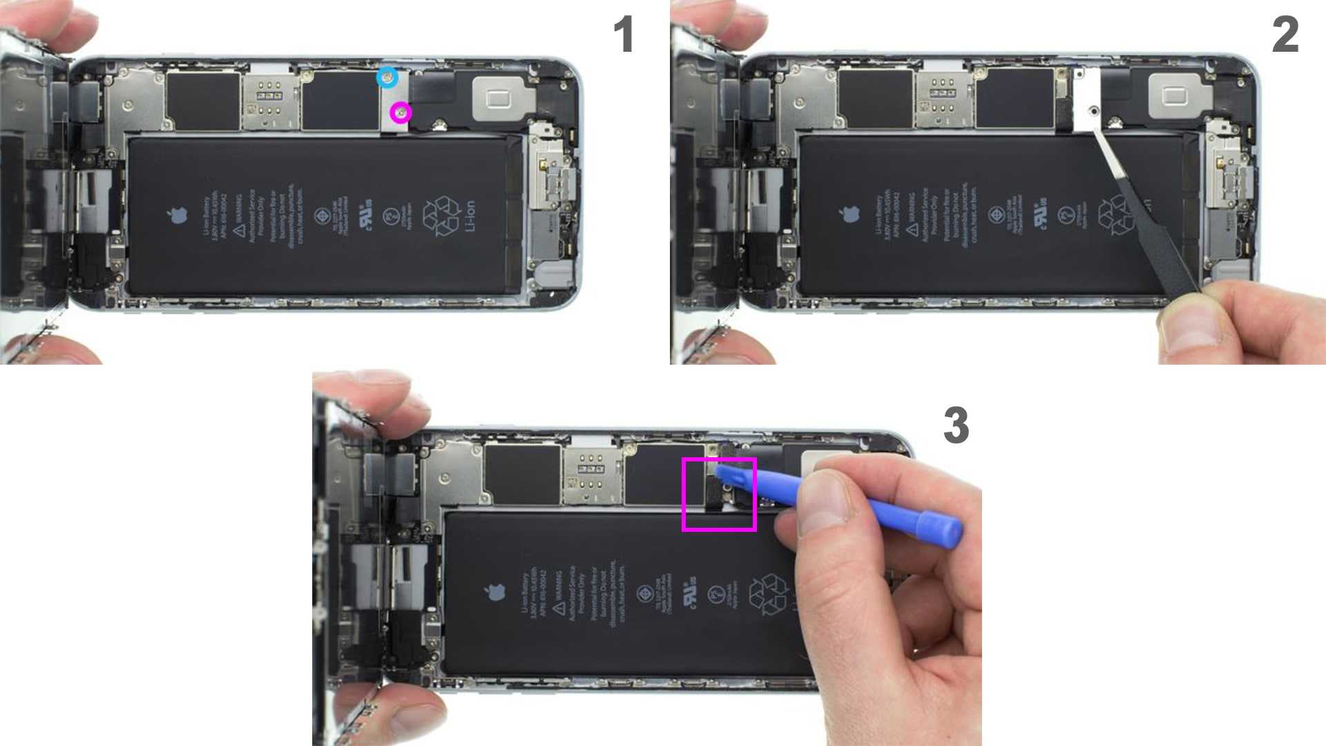 Далее вам нужно открутить пять отмеченных винтиков (красный — 2.6 мм, розовый 1.2 мм, голубой — 1.6 мм), которые удерживают металическую крышку и снимите ее. Теперь отсоедините три отмеченных разъема в порядке, указанном ниже. Будьте очень осторожны и внимательны. Поместите острый конец пластиковой лопатки чуть ни же каждого контакта и поднимите его: Синий — Touch ID кабель Голубой — Фронтальная камера / датчик приближения / слуховой динамик / микрофон Розовый — Дисплей.