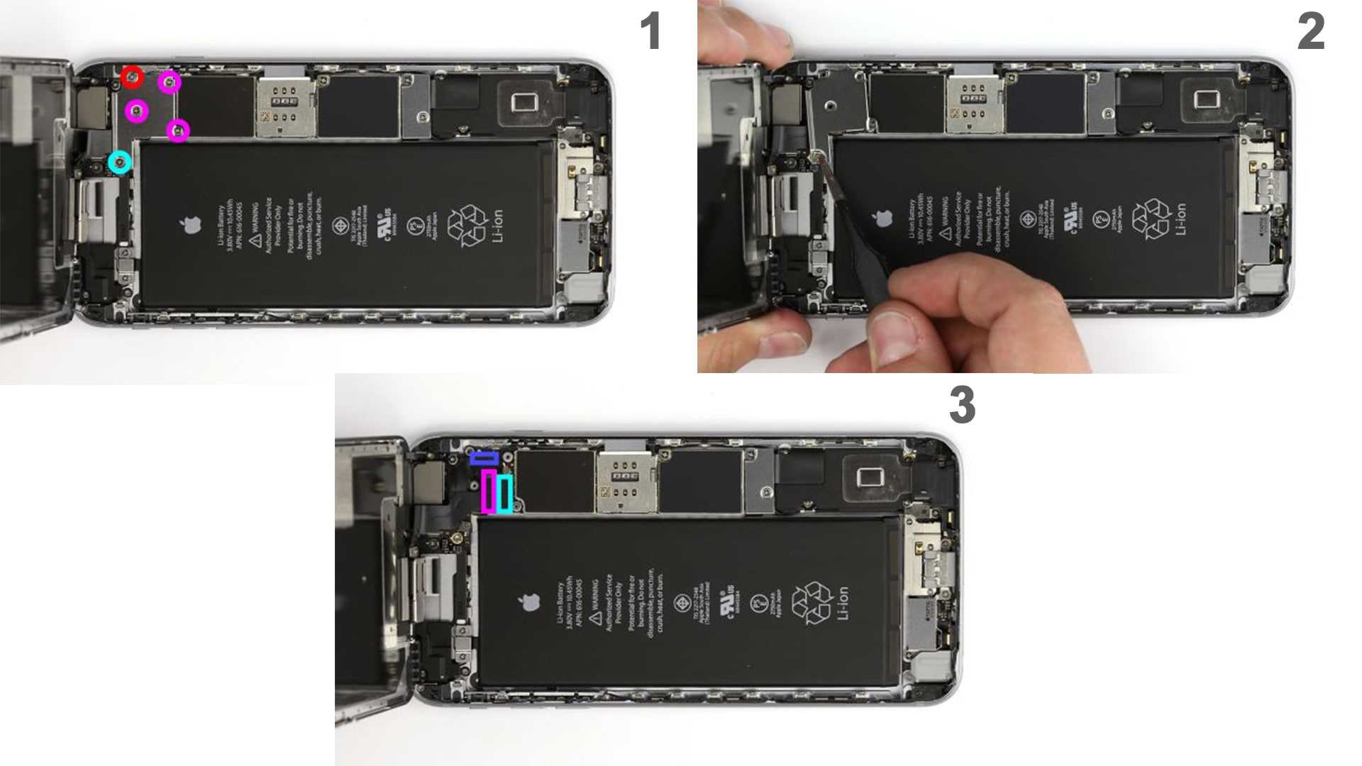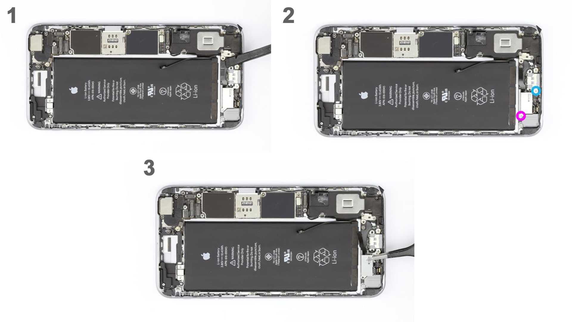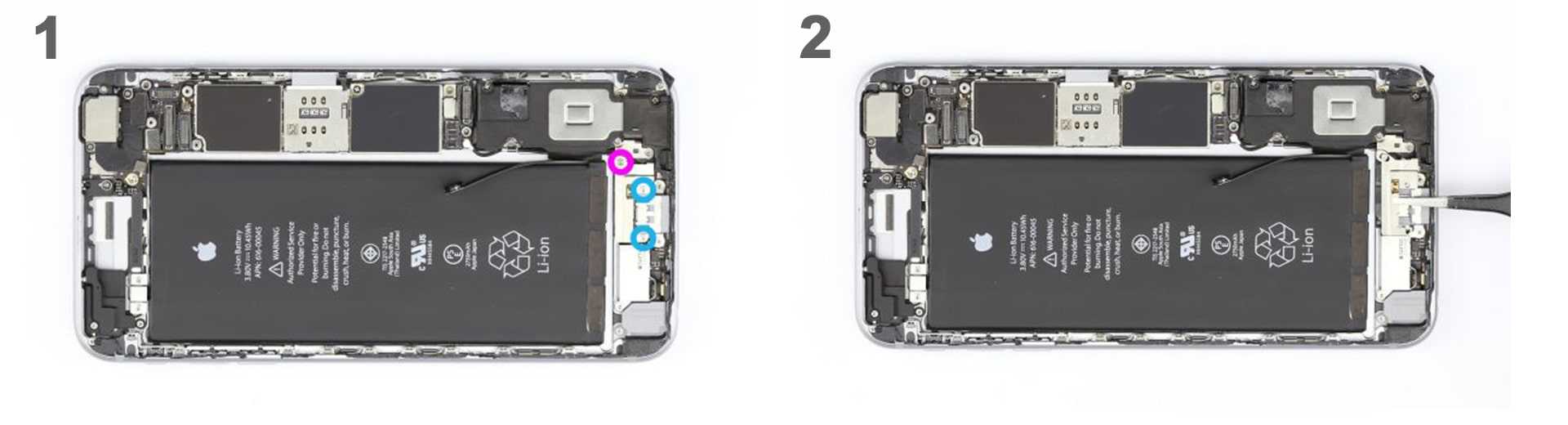 Теперь открутите два отмеченных винтика (голубой — 2.0 мм, розовый — 2.9 мм) и с помощью пластиковой лопатки осторожно отсоединяете нижний разъем для аккумулятора, антенны и разъема Lightning