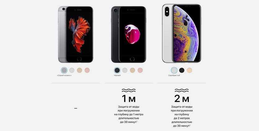 iPhone Xs защищён от влаги и пыли по стандарту IP68. На странице смартфона на сайте Apple, указано, что у него: