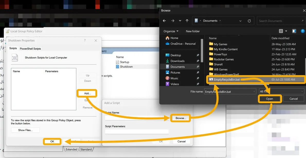 - Дважды щелкните сценарий «Завершение работы», затем выберите «Добавить», а затем «Обзор».