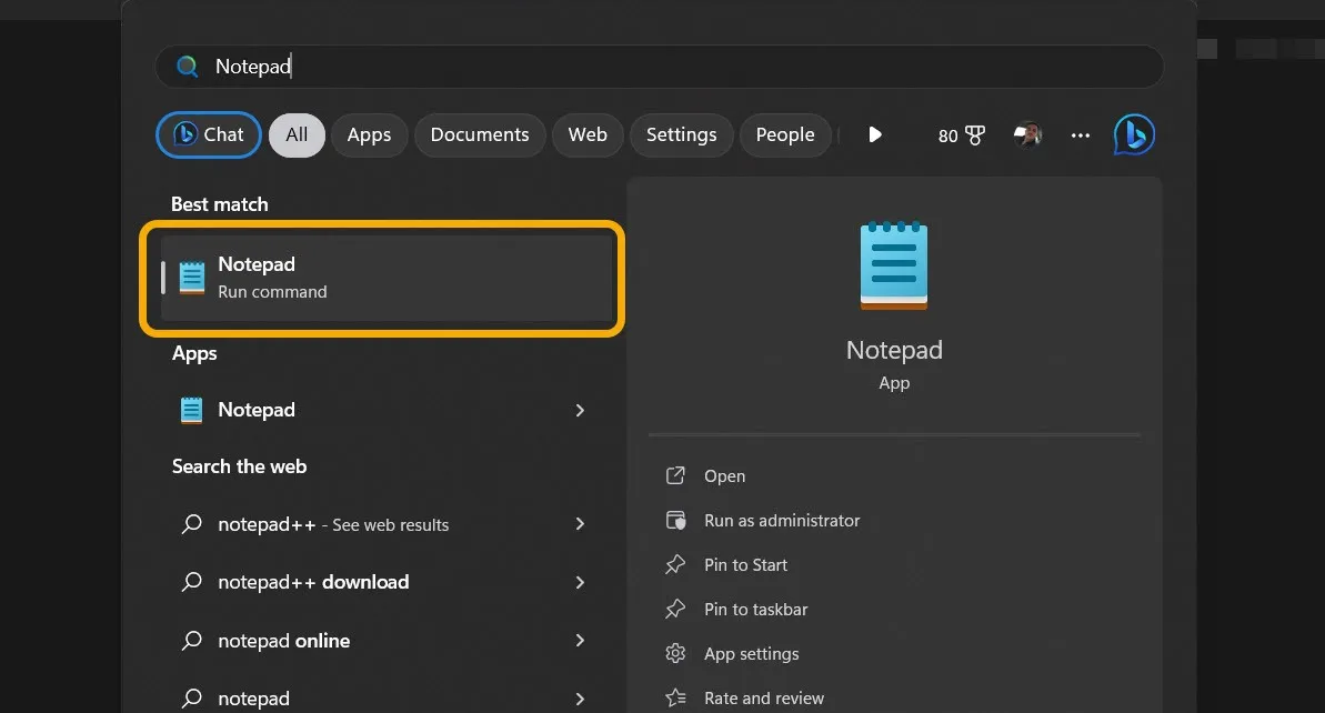Мы начнем с создания пакетного файла (.BAT) с помощью встроенного в Windows Блокнота. Введите «Блокнот» в поиске Windows и щелкните ниже, чтобы запустить его.