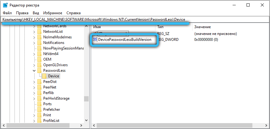 - Теперь потребуется пройти по такому пути: HKEY_LOCAL_MACHINE\SOFTWARE\Microsoft\Windows NT\CurrentVersion\PasswordLess\Device.