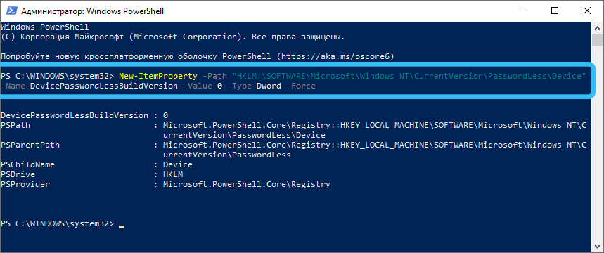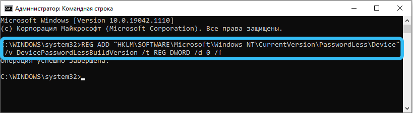 reg ADD «HKLM\SOFTWARE\Microsoft\Windows NT\CurrentVersion\PasswordLess\Device» /v DevicePasswordLessBuildVersion /t REG_DWORD /d 0 /f.