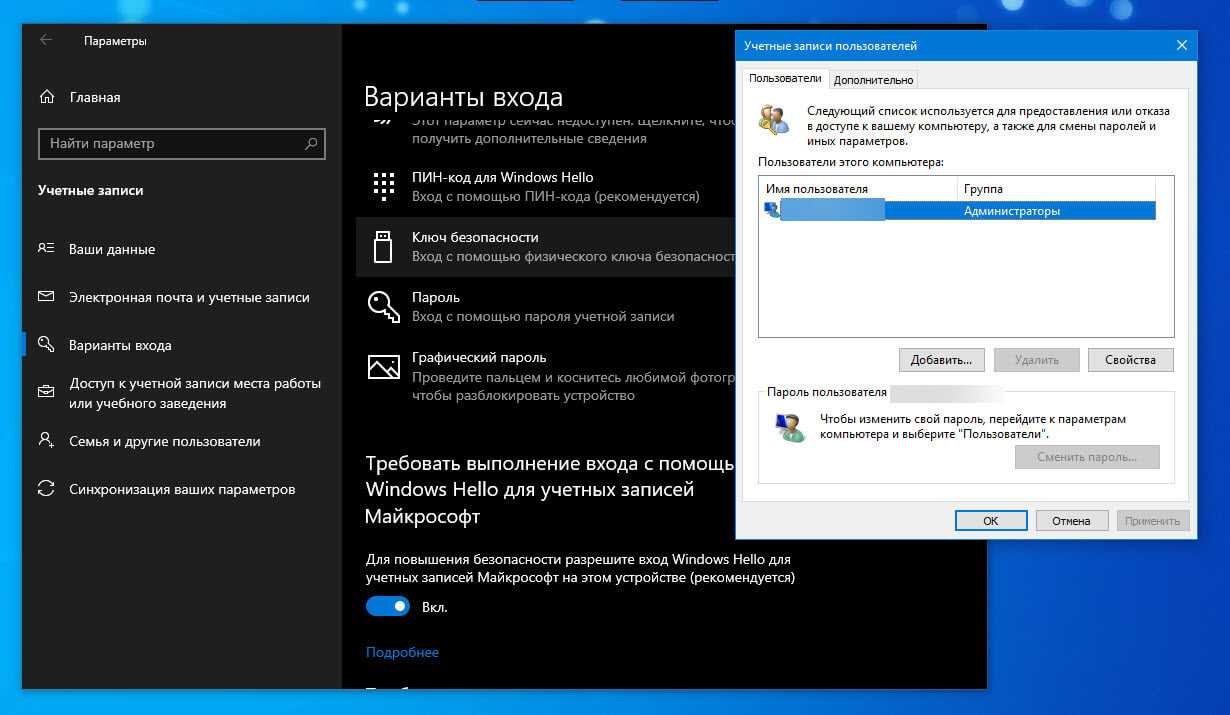 Начиная с Windows 10 build 19033, если вы установили PIN-код или другую безопасную функцию Windows Hello, Windows 10 скрывает параметр «Требовать ввод имени пользователя и пароля», чтобы использовать этот компьютер в классическом стиле control userpasswords2. Смотрите следующий скриншот: