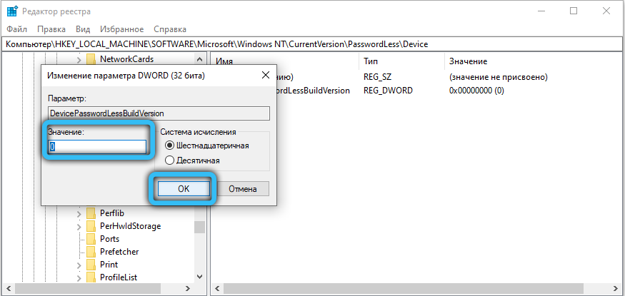 - Затем раскрыть свойства DevicePasswordLessBuildVersion, и установить там цифру «0». Не стоит забывать о необходимости перезагрузки.