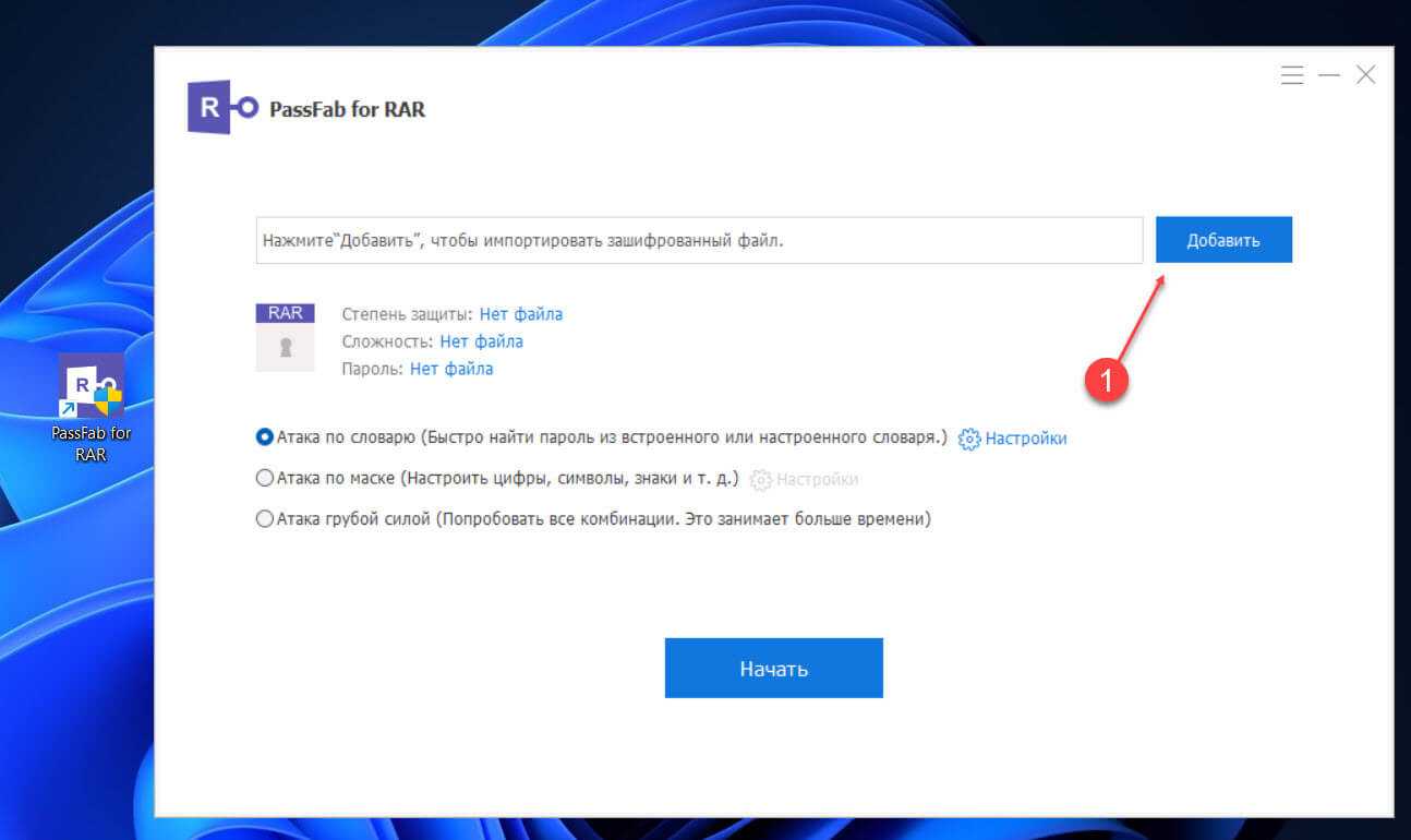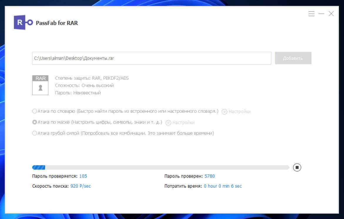 Программа устанавливается из инсталлятора в несколько шагов. После запуска укажите нужный архив, нажав на кнопку Добавить. Выберите один из трех режимов работы: атака по словарю, по маске или грубой силой. Атака по словарю — это подбор кода с использованием специального словаря. При атаке по маске пользователь указывает программе известные характеристики пароля: длина, используемые символы. Атака грубой силой — это режим, использующий все доступные методы поиска.
