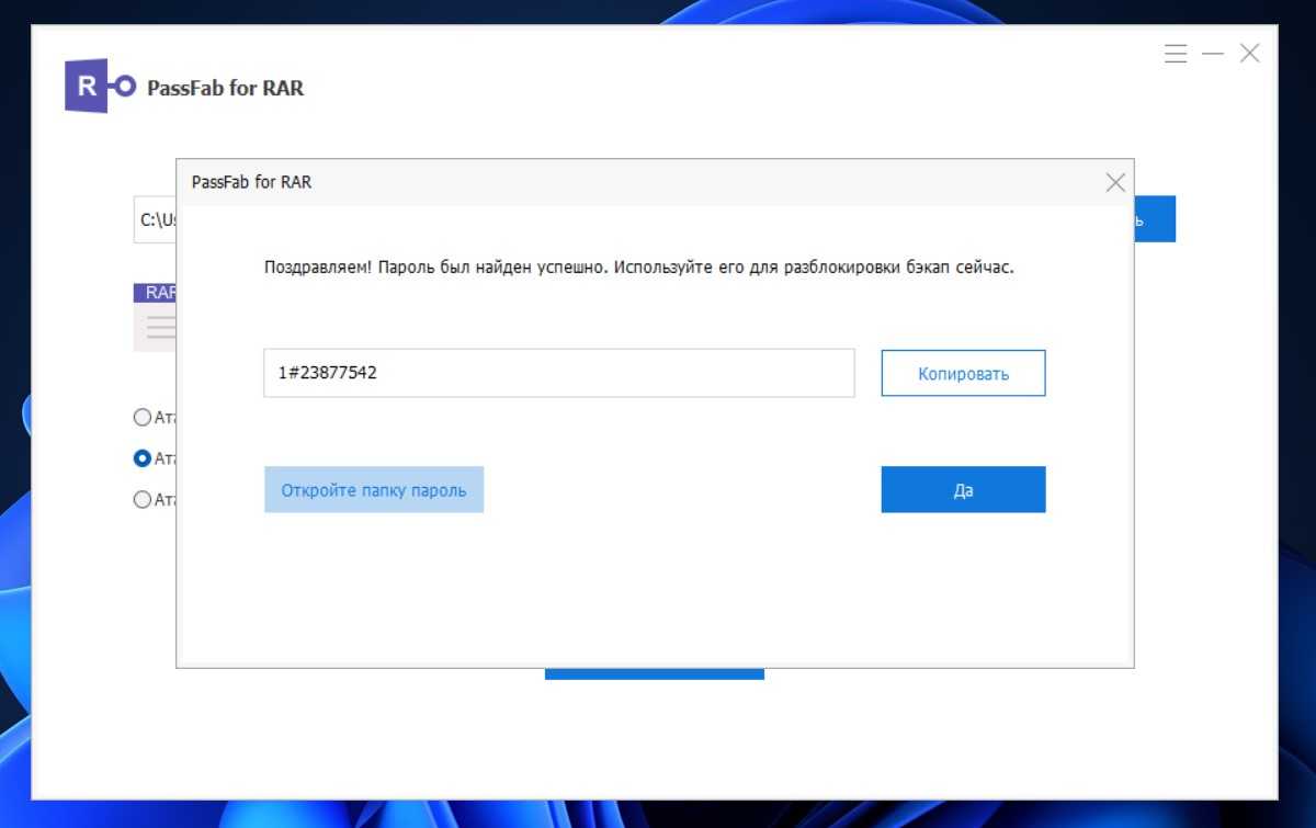 PassFab for RAR — эффективная программа для снятия пароля с архивов формата .rar без потери данных. Она использует разные технологии в работе, что позволяет сбрасывать защиту быстрее. Утилита имеет две версии: полную платную и бесплатную с ограниченным функционалом. Бесплатная позволяет увидеть только часть от найденного пароля, однако зачастую этого достаточно, чтобы вспомнить забытый код.