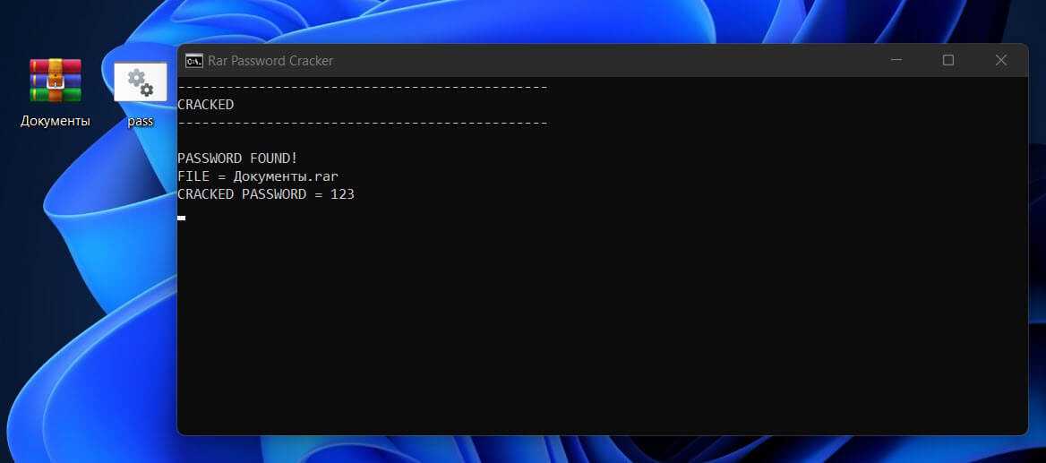 Теперь командная начнет подбор пароля, который вы использовали для защиты файла winRAR. Это займет некоторое время в зависимости от длины и сложности пароля.